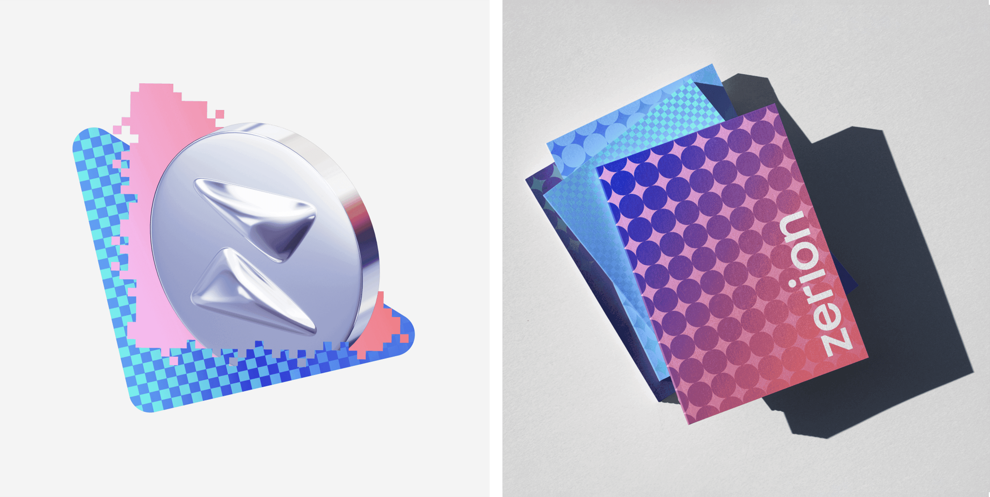 Graphics enrich the visual language by introducing movement and functionality. The central idea focuses on dynamically manipulating triangles through rotation, transformation, and intersection, highlighting Zerion's versatility.